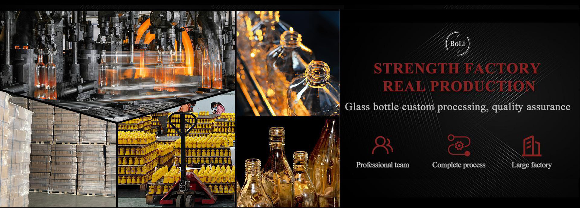 Since it was founded, Boli has always adhered to the operation philosophy of “manufacturing quality products and offering high-end services.” Therefore, Boli has been well received by new and regular customers at home and abroad by strictly controlling product quality and constantly improving services,from the imagination to the actual production of the bottle, is followed up by our team. Delivering a beautiful glass bottle. Our team designs glass bottles in more than 300 shapes and colors, and we can also do further processing (embossing, screen printing, coating, frosting, hot stamping, stickers, pendants, etc.) to make our customers’ glass bottles more valuable.